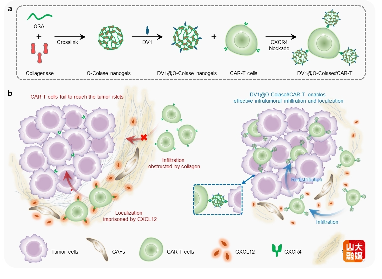 嵌合抗原受体(CAR)T细胞疗法在治疗血液恶性肿瘤中取得了显著突破,但其在实体瘤(如胰腺癌)中的疗效仍受限制。栾玉霞教授团队研究发现,CAR-T细胞在实体肿瘤中的导航缺陷(包括肿瘤内浸润不足和空间定位不佳)是导致疗效不理想的关键因素。基于此,团队提出了一种创新的胶原酶纳米凝胶背包策略,旨在解决这一导航缺陷,从而大幅提高CAR-T细胞治疗实体瘤的疗效。