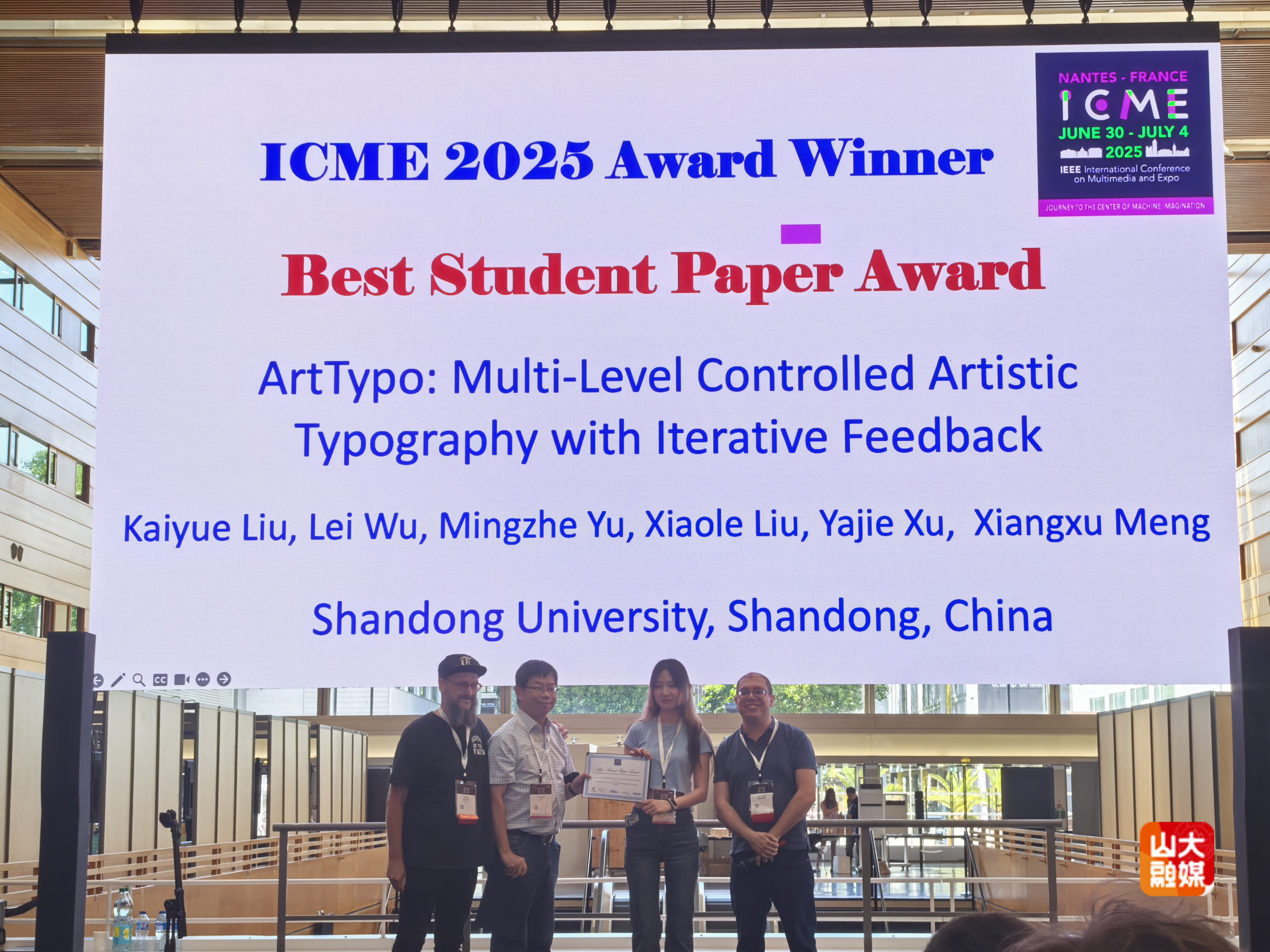 [本站讯]近日,第27届IEEE国际多媒体与博览会(ICME 2025)举行,山东大学软件学院数字媒体技术教育部工程研究中心武蕾副教授课题组的研究成果“ArtTypo: Multi-Level Controlled Artistic Typography with Iterative Feedback”获“最佳学生论文奖”。学院硕士研究生刘凯悦作为第一作者,武蕾副教授担任通讯作者,指导教师为学院教授孟祥旭。