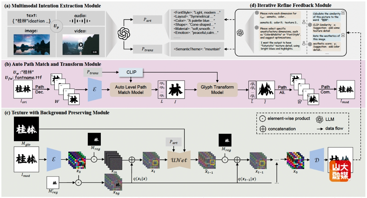 针对艺术排版中“表现力与可读性难以兼顾”的行业痛点,ArtTypo构建了多层次、多模态引导的生成框架,通过三大技术创新实现突破:一是支持多模态输入,可灵活响应文本、图像等多样化设计需求;二是集成自动路径匹配与形状转换技术,高效完成字体形态的艺术化重构;三是通过多掩码引导扩散过程精准控制纹理与背景生成,提升整体设计的艺术质感。尤为关键的是,该技术引入迭代反馈机制,能基于设计效果动态优化参数,最终在艺术创意的丰富性与文字信息的清晰传递之间达成突破性平衡。这项成果标志着团队在智能设计工具研发领域迈出了重要一步。