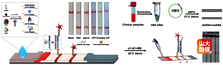 团队基于多通节DNA对目标物识别的灵活性,构建了面向不同类型生物标志物分析的可视化检测试纸,以目标物存在时诱导形成的DNA四通节或三通节为桥联结构,连接DNA修饰金纳米粒子到测试区捕获链产生试纸条显色,实现一种侧向流动试纸对乙肝病毒DNA、肿瘤标志物microRNA-21、生物分子ATP、凝血蛋白和末端延伸酶活性等五种生物标志物的灵活检测。团队与山东大学齐鲁医院检验科合作,实现临床血清样本中乙肝病毒的试纸可视化检测。该策略在目标物变换时无需重新制备检测试纸,仅需更换无标记的DNA试剂包,从而降低了检测成本和缩短整体分析时间,拓宽了检测试纸的目标分析对象。