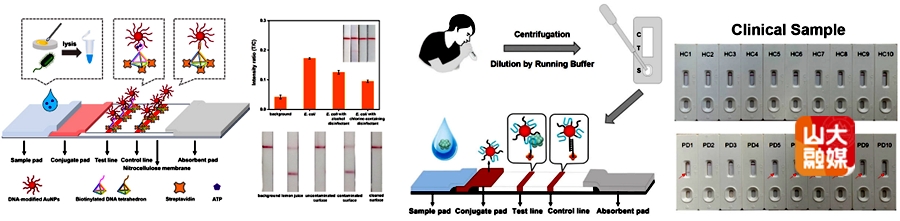 同时,团队利用DNA四面体结构改良硝酸纤维素膜基底,使捕获探针空间有序地分布在试纸条的测试区和对照区,提高了检测试纸的分析性能和抗基质干扰能力。团队还构建出一种检测α突触蛋白寡聚体的侧向流动分析试纸,并与山东第一医科大学附属省立医院神经外科合作,在无需侵入性采样的条件下,以人唾液为样本,应用于帕金森疾病的试纸可视化诊断。