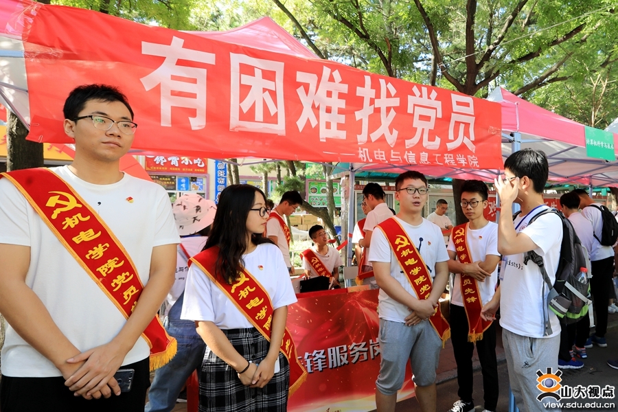 威海校区机电学院设置党员先锋服务岗,为新生提供贴心服务。