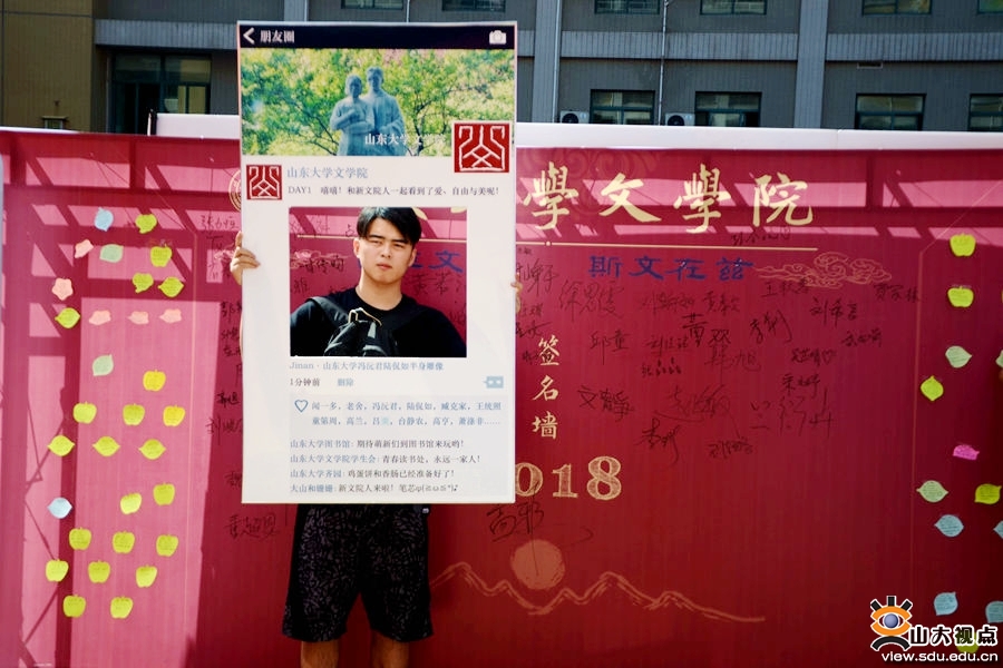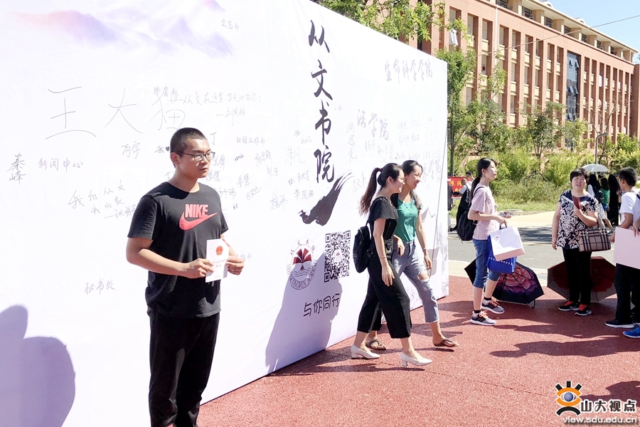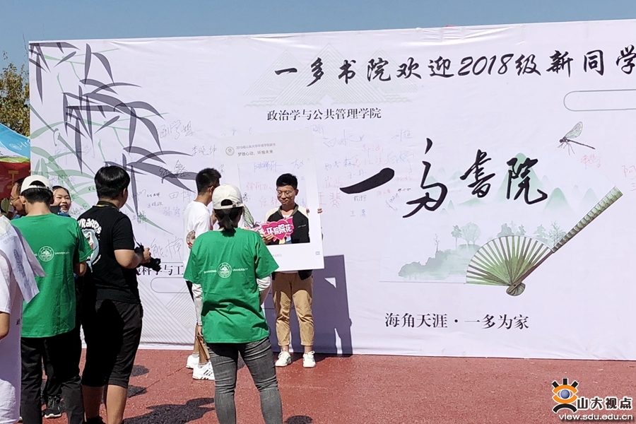 青岛校区的新生报到后,纷纷在一多书院、从文书院展板前留影。海角天涯,一多为家;逐梦山大,从文起步。