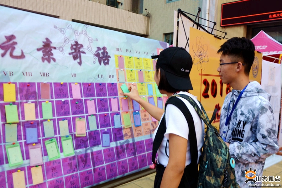 化学与化工学院迎新展台前的元素寄语墙饱含着理工科的情怀与创意。化学元素周期表上,色彩缤纷的实用卡套既装载着化学学科的基础知识,又承载着对每一位新生的美好期冀。