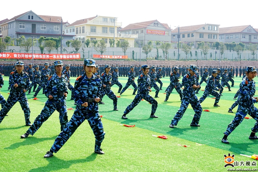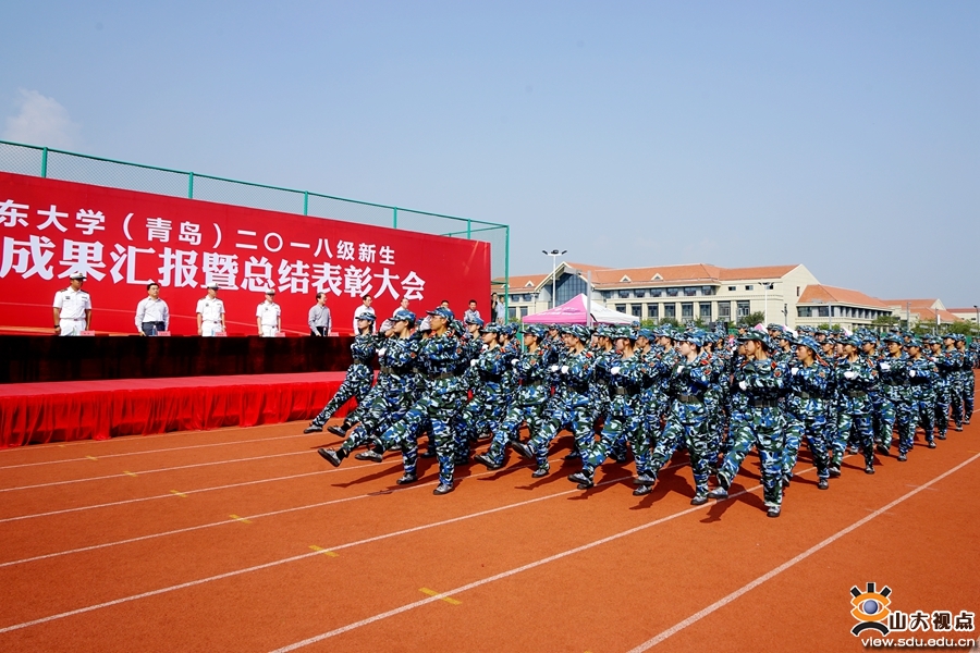 伴着雄壮的国歌,军训成果汇报正式开始。分列式中,一营、二营八个连队依次走过主席台。他们迈着铿锵有力的步伐,喊着响彻云霄的口号,精神饱满、英姿飒爽,展示出了二十天军训的优异成果。在课目表演中,海军旗语表演规范流畅,演绎“我的山大,我的家”“学无止境,气有浩然”,彰显了独特魅力;军体拳、匕首操表演动作简洁有力,气势恢宏磅礴,展现了坚忍不拔、勇敢顽强的战斗作风。