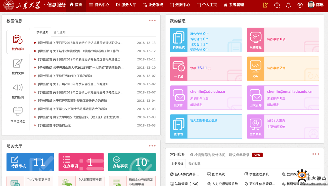 学校人事信息系统、财务信息系统、科研信息系统(科技、人文社科)、学生信息系统、学生就业信息系统、招标信息系统、资产信息系统等均已完成更新改造上线运行。国际事务信息系统、审计信息系统、数字共青团、工会信息系统、校友信息系统等全新上线,均集成进入信息化公共服务平台。