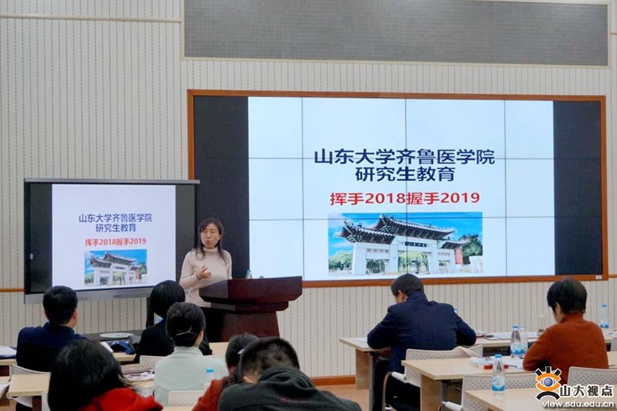 马春红介绍了医科研究生教育的整体情况,并以“挥手2018,握手2019”为题对2018年医学研究生教育进行了全面总结。总结包括五部分:齐鲁医学院研究生生源质量提升各项举措及成绩突破;齐鲁医学院2018年研究生招生机制改革及成效;齐鲁医学院聚焦研究生培养质量提升的各项举措、成绩、特色及问题;各单位研究生培养质量及未正常授位原因分析;医科学位论文质控流程规范及提升论文质量的途径举措。马春红希望2019年研究生教育继续推进优质生源延揽工作,充分调动导师和医院积极性;大力推进“Med+X”学科交叉人才培养;不断优化课程资源建设,推动医学研究生教育方式方法的现代化进程;切实完成包括“管理理念提升、导师培训指导、互联网+课程建设、Med+X交叉人才培养、研究生学术交流活动在内的齐鲁医学院研究生教育“五大”工程,同时形成医科研究生管理团队的文化与特色。