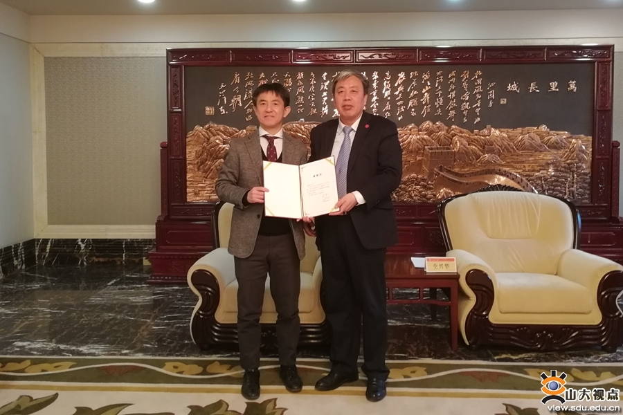 [本站讯]1月18日,三菱商事(青岛)有限公司总经理藤井伸明一行到访山东大学。山东大学副书记仝兴华会见客人并代表山东大学向三菱商事颁发感谢状。