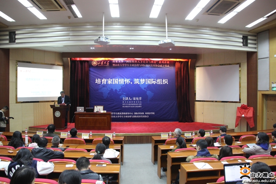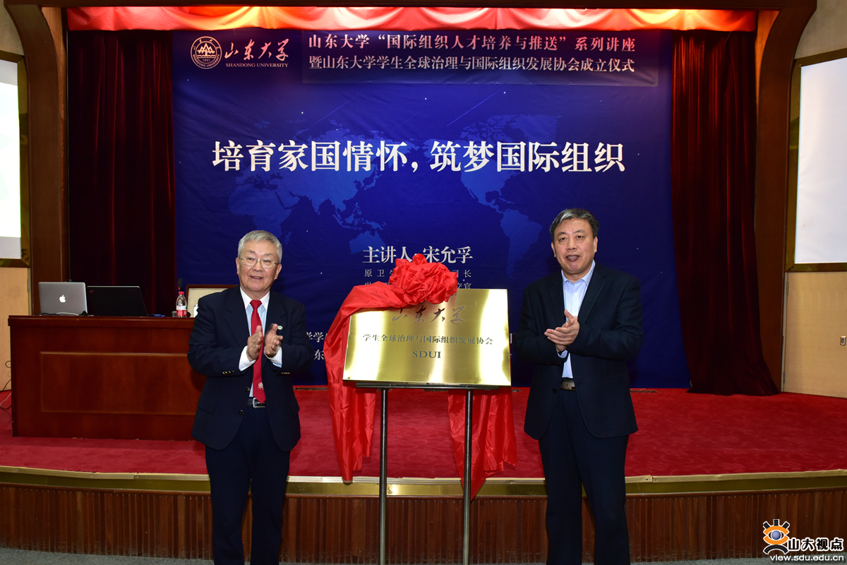 [本站讯]3月23日,山东大学“国际组织人才培养与推送”系列讲座暨学生全球治理与国际组织发展协会成立仪式在中心校区举行,卫生部外事司原司长、世界卫生组织前资深外交官、联合国改革与伙伴计划协调员宋允孚担任主讲,山东大学党委副书记仝兴华出席活动。宋允孚和仝兴华共同为山东大学学生全球治理与国际组织发展协会揭牌。