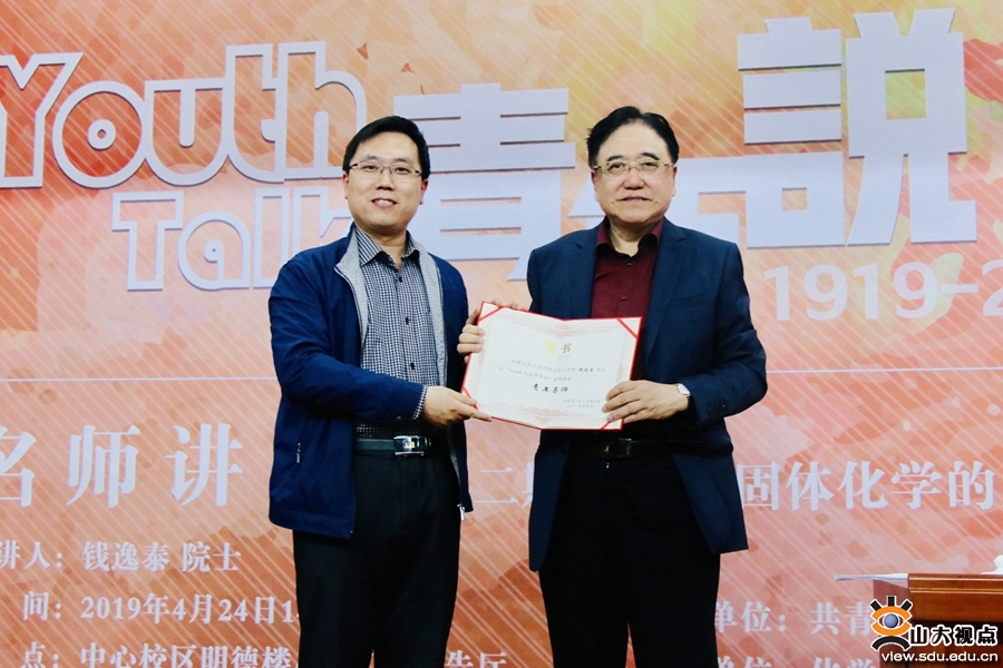 随后,山东大学团委书记张熙为钱逸泰院士颁发了名师讲堂青年导师的特聘证书。