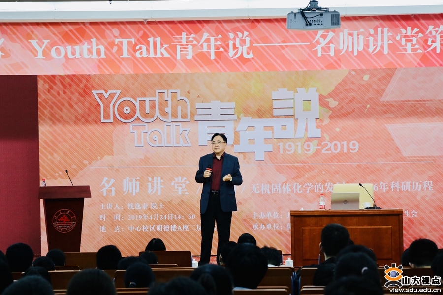 [本站讯]4月24日,“Youth Talk青年说”名师讲堂第二期在中心校区举行。中国科学院院士、山东大学化学与化工学院钱逸泰教授作了专场报告,山东大学团委书记张熙、化学院党委副书记孙国翠、化学院副院长方珺出席活动。