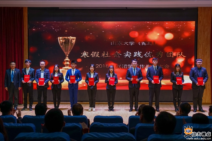 青岛校区党工委、校长办公室主任周加强为“寒假社会实践优秀团队”颁奖。