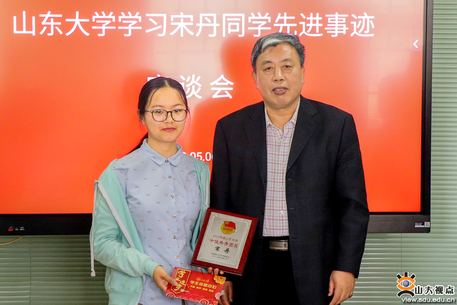 仝兴华向宋丹同学颁发十佳共青团员证书,并发放慰问金。他认真听取了参加座谈会师生代表的发言后表示,宋丹同学从造血干细胞捐献的宣传者、参与者到实践者、奉献者,真正践行了山大青年学子的知行合一,以实际行动彰显了山大学子的情怀与担当,体现了当代大学生的社会责任感和高尚品德,她胸怀大爱、甘于奉献的精神值得每一位师生医务员工学习。他谈到,一所大学的大爱、大气表现在,学生在大学所营造的氛围和环境的影响与熏陶下展示出来的优秀品质能够深深地感动老师、感动同学,宋丹和其他所有爱心社团的同学们用他们的奉献行为感动了师生们,充分展现了山东大学学生的高尚情操。山东大学作为一所有温度的大学,致力于培养“中国最优秀的本科生”,他号召大家学习宋丹精神,传递榜样的力量,弘扬正气和正能量,营造良好校园氛围,引导鼓励同学们有勇气去做有意义的事情,做最好的自己。他希望学校的爱心社团越来越大,有更多的“宋丹”能够涌现出来,让爱心在山大校园牢牢扎根,在齐鲁大地上茁壮成长,在全社会传播和弘扬。他鼓励宋丹及广大学子勤于学业、敢想敢为,并要求学生工作部门和学院积极关注宋丹同学后续的成长发展。