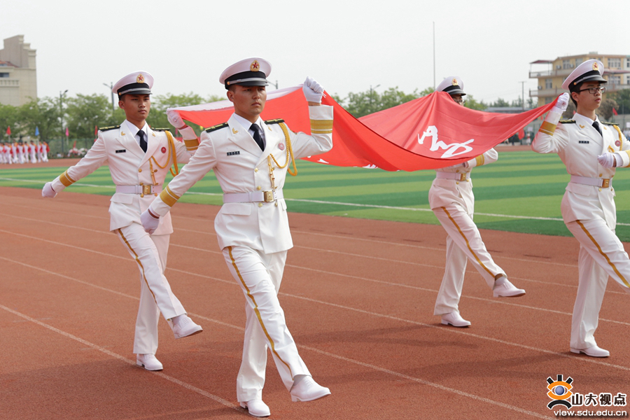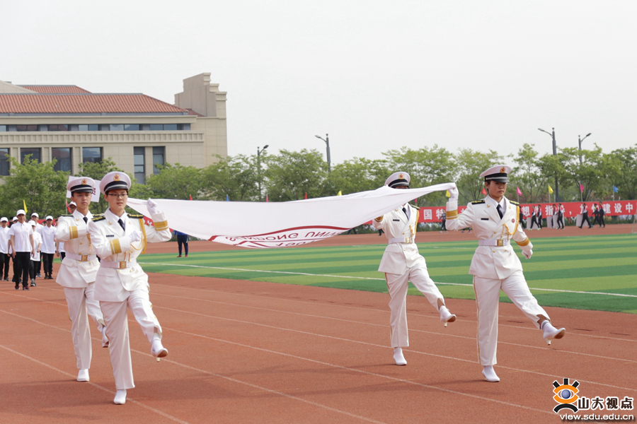 开幕式上,青岛校区国旗方队、校旗方队、校徽方队踏着《运动员进行曲》慷慨激昂的鼓点,迈着坚实而整齐的步伐率先走过主席台。
