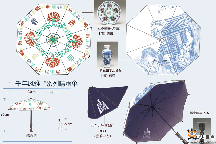 参赛作品形式多样,创意丰富。比如灵感为铜觚的花瓶,简单又不失品味内涵;蛋壳陶主题的文具礼盒,包含笔记本、尺子、笔、笔袋、U盘等,具有较高的知名度利于其推广;灵感为青铜鸟柱的飞鸟云雷晴雨伞分为女式飞鸟晴雨伞、男式云雷晴雨伞,配色与性别相符合;结合了汉代酒器文化因素的魔方新奇而独特;融入瓷文化的吊坠、中山装扣子、文化衫蕴含了丰富的文化因素;五彩宝相花改良袄裙服饰采用宝相花纹盘元素和配色,包括上袄、下裙、配饰,与中华汉服相贴切;融入瓷器元素的笔记本,有较高的视觉体验。其他参赛作品还有古风雨伞、“千年风雅”系列晴雨伞、“铜簋说”系列制作等,既多方面呈现了藏品的文化价值,又充分考虑了设计作品的实用价值,让古老的文物焕发出新的光彩。