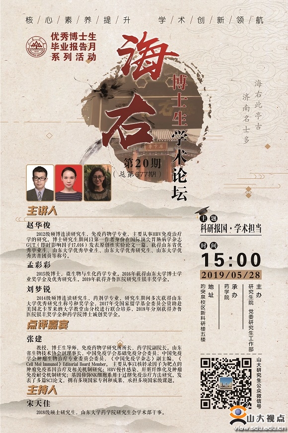 人才为强校之本、学术为兴校之要、文化为立校之魂。“海右”博士生学术论坛是山东大学知名研究生学术活动品牌。论坛由研究生院、党委研究生工作部主办,各研究生培养单位承办,覆盖一校三地研究生培养单位,累计举办学术讲座600余场。