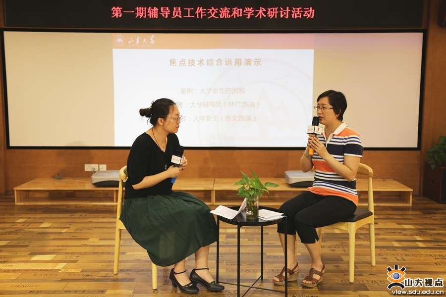 在交流环节,杨璐介绍了焦点解决短期心理咨询这一心理咨询方法,着重介绍了这一方法与其他心理咨询流派不同的理念和12种提问技术。焦点解决短期心理咨询基于建构主义的思想,结合积极心理学的理念,立足人性观,聚焦正向的、积极的方面;当遇到问题的时候,重要的是问题的解决,不是问题的原因,而在这个过程中,当事人要成为解决自己问题的专家;要相信小改变能带来大改变。随后,他详细介绍了赞许技术、正常化技术、预设性提问技术、奇迹提问技术等12种技术的典型样句,并结合辅导员的工作实践,阐释了这些技术在与学生的沟通中如何使用。为了让大家对如何使用这些技术有更直观的理解,林竹和许文结合当代大学生的实际,表演了名为《大学新生的困惑》的心理剧,展示了各种技术如何在沟通中灵活运用。