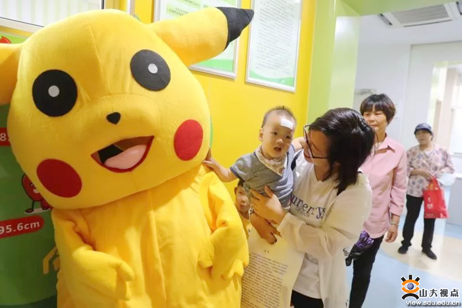 守护健康,放飞梦想。广智南楼一楼的儿科门诊里,可爱的卡通人物“皮卡丘”惊喜现身,为就诊的小朋友送福利,舒适温馨化的治疗,点滴真情,输入爱心,让小朋友们笑容绽放。