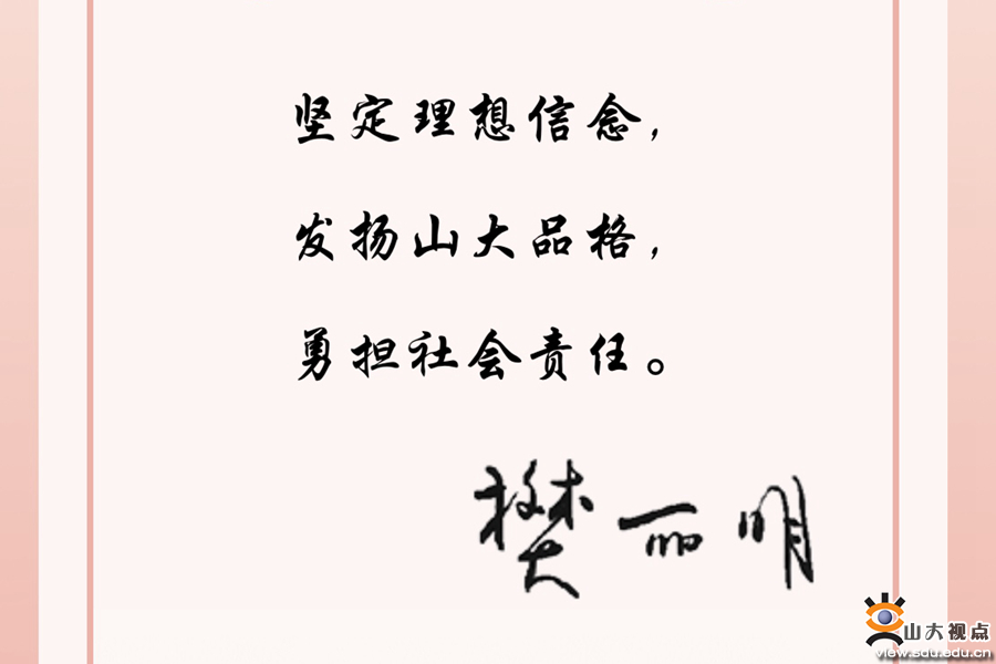 樊丽明为毕业生寄语:坚定理想信念,发扬山大品格,勇担社会责任。她希望山大学子胸怀理想、坚定信念、勇敢担当,时刻以追求卓越、只争朝夕的精神要求自己,做一名有深厚家国情怀的山大人。