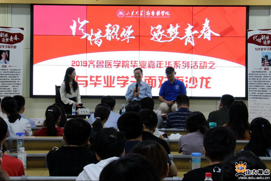 6月17日下午,校友与毕业学子面对面活动在趵突泉校区举行。活动邀请首都医科大学附属北京胸科医院副院长、中华医学会结核病学分会主任委员李亮,南京大学人工智能生物医药技术研究院副院长兼产业公司总经理杨晨两位校友重返校园,与毕业生面对面交流。