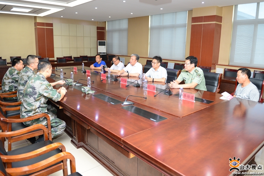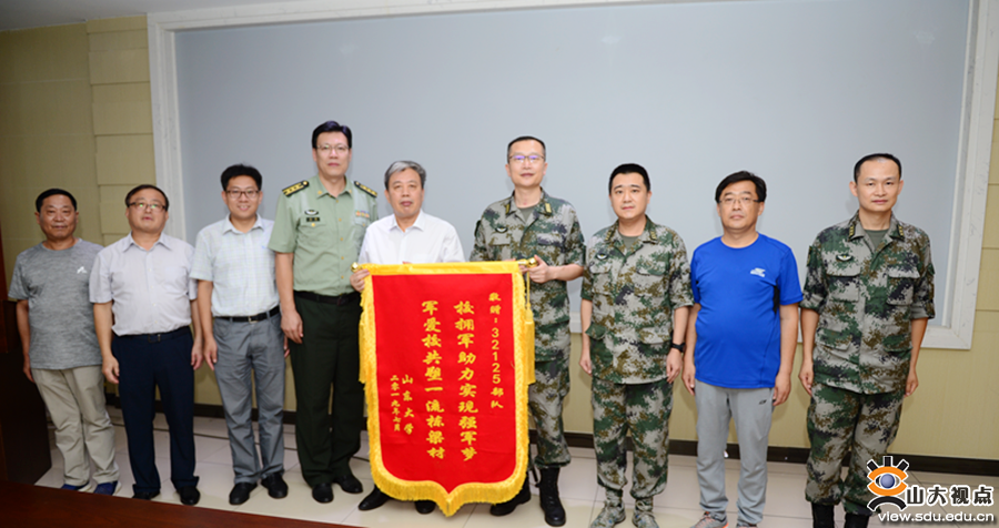 [本站讯]为发扬学校拥军优属的光荣传统,巩固双拥工作的成果,7月30日,山东大学党委副书记仝兴华一行前往32125部队进行慰问并赠送锦旗,共谋军民融合发展大计。32125部队部队长黄龙强大校、副政委于晓飞上校、政治部主任朱起玉上校参加座谈会。