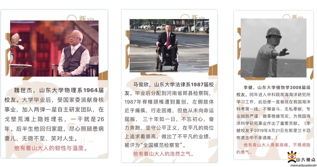 坚持山大梦想,传递山大力量。9月4日,山大人官方微信发布了 “坚守山大梦想,传递山大力量” 的主题文章,致敬每一位在自己的岗位上精勤进取、笃行不倦、将校风校训化为实际行动的山大人,他们是山大最鲜活的名片。