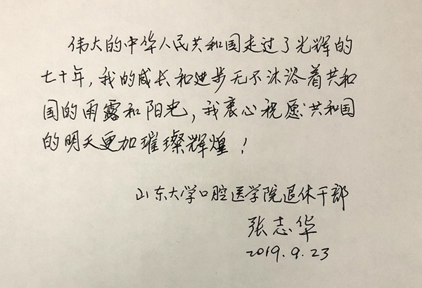 韩吉香(校医院退休教职工):与伟大的新中国诞生于同一年,我是幸运的。七十年来,伴随着祖国的蓬勃发展和欣欣向荣,我与祖国同呼吸共成长,在自己平凡的工作岗位上度过了充实而不平凡的大半生。如今我虽年迈,但仍然能够幸运地见证祖国的强大,心中无限感慨。衷心祝愿伟大的祖国繁荣昌盛,再创辉煌!