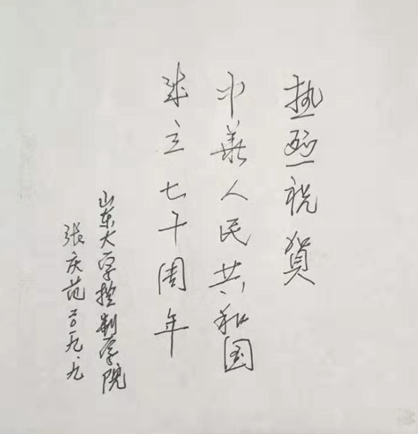 邵瑞琪(药学院退休教职工):在中华人民共和国70华诞即将到来之际,作为新中国的同龄人,我感到无比自豪和骄傲!我们这代人的标签是生在新社会,长在红旗下。爱祖国,爱人民,到祖国最需要的地方去,贡献自己的一切力量,是发自内心的追求。对祖国的深情,渗透在我滚烫的血液中,跳动在我火热的心中。与新中国同行,是我一生的荣幸!衷心祝福我亲爱的祖国繁荣昌盛!祝福全国各族人民幸福安康!祖国万岁!