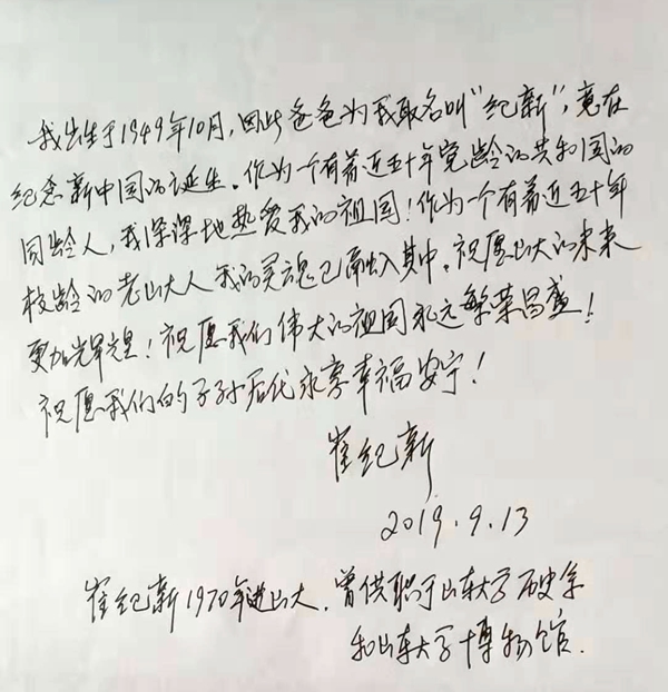 赵景宪(政治学与公共管理学院退休教职工):回首往事,心潮澎湃,自己的70年历历在目。每每回忆自己走过的路,深深体会到,祖国是我的家,党是我的母亲。