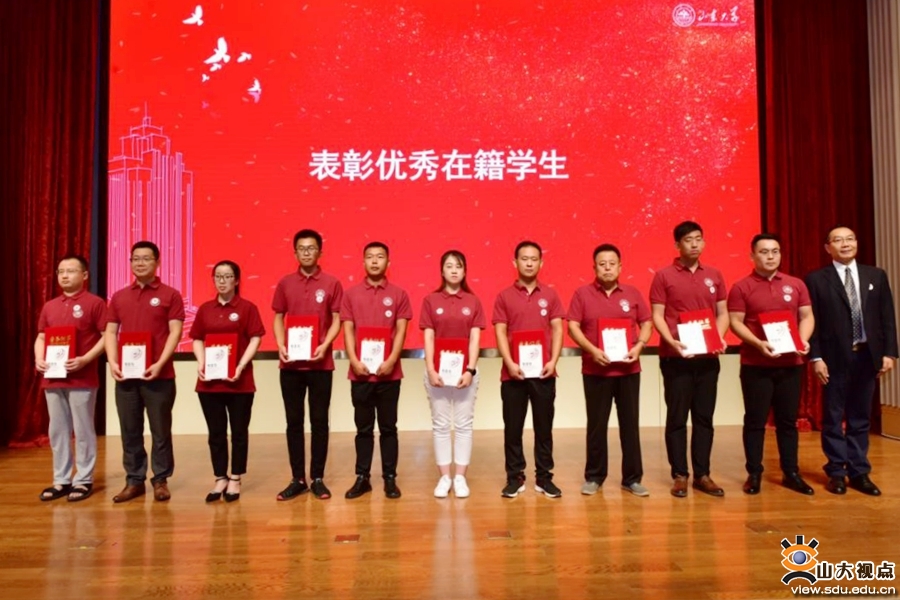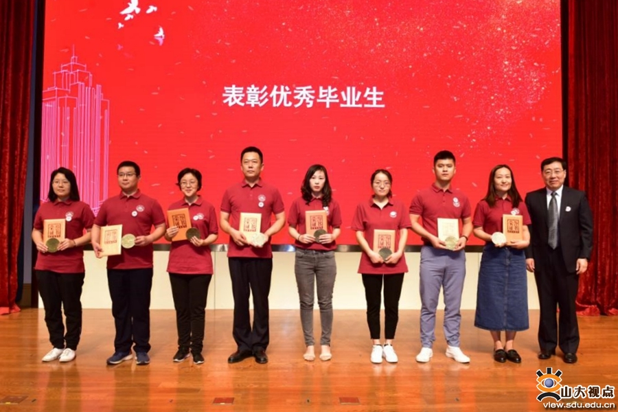 山东大学继续教育学院院长靳光华为同学们送上寄语,宣读了优秀毕业生表彰决定并为优秀毕业生颁发了荣誉证书。他希望同学们在山东大学学习知识得同时,养成终身学习的能力。典礼第一部分在全体师生共唱《我和我的祖国》中结束。