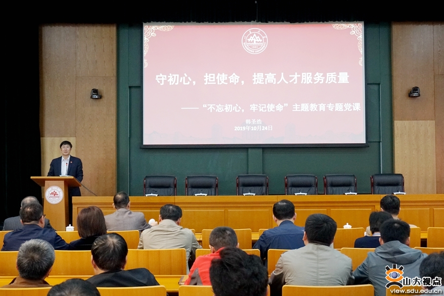 [本站讯]10月24日下午,山东大学(青岛)“不忘初心、牢记使命”主题教育专题党课在华岗苑南楼报告厅举行。山东大学副校长、青岛校区校长、学校“不忘初心、牢记使命”主题教育领导小组成员韩圣浩,以“守初心、担使命 提升人才服务质量”为题作专题党课报告。