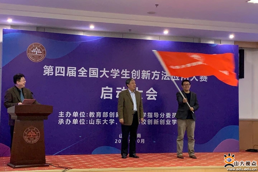 大赛启动仪式分为三个环节。第一个环节,由教育部创新方法指导分委员会委员、竞赛组组长、中国高校创新创业学院联盟创新方法应用大赛专门委员会副主任委员、大连海事大学创新创业学院院长石丽红代表教指委向山东大学授大赛赛旗,陈言俊代表山东大学接旗。第二个环节,由仝兴华向新成立的山东大学创新方法实验班授旗,实验班班主任曹利华接旗。第三个环节,仝兴华,石丽红,林岳,教育部创新方法指导分委员会委员、中国高校创新创业学院联盟创新方法应用大赛专门委员会副主任委员、燕山大学史艳国,陈言俊、中国技术创业协会创新创业专家工作委员会秘书长、中国高校创新创业学院联盟创新方法应用大赛专门委员会副主任委员张春欣共同上台,点亮大赛启动球。