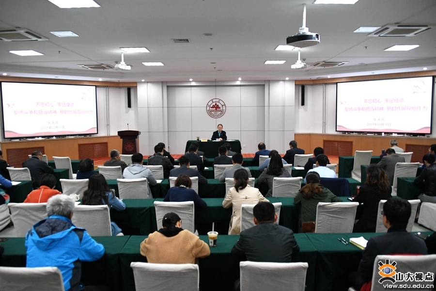 随后,张永兵就新时代为什么要发扬斗争和担当精神谈了自己的看法。他强调,第一,发扬斗争和担当精神,是推进新时代党和国家建设事业的需要。当前国内外形势复杂多变,“四大考验”“四种危险”长期存在,我们正在进行具有许多新的历史特点的伟大斗争,必须保持清醒、坚定意志,时刻绷紧斗争这根弦,做好充分的斗争准备,敢于担当、善于担当,敢于斗争、善于斗争,坚决打赢来自各方面的挑战。第二,发扬斗争和担当精神,是山东大学“双一流”建设的需要。目前学校已经启动了“百廿山大强校兴国”行动,我们既面临“由大到强”和“双一流”建设的良好态势,又面临一些发展的问题和困难,全体师生医务员工尤其是党员干部要以更加强烈的担当意识和更加有韧性的斗争精神,立足岗位、尽职尽责,敢于担当、甘于奉献,追求卓越、只争朝夕,确保我们在“由大到强”历史性转变和“双一流”建设新征程上越走越远,越走越宽阔。第三,发扬斗争和担当精神,是高校宣传统战以及群众组织、网信等部门党员干部的应有素养。办好山大的事情,关键在于坚持党的领导。要解决改革进程中积累的问题,党务部门、党员干部必须学在前、走在前,斗争在前、担当在前,只有这样,才能实现真正的和谐稳定、真正的快速发展。