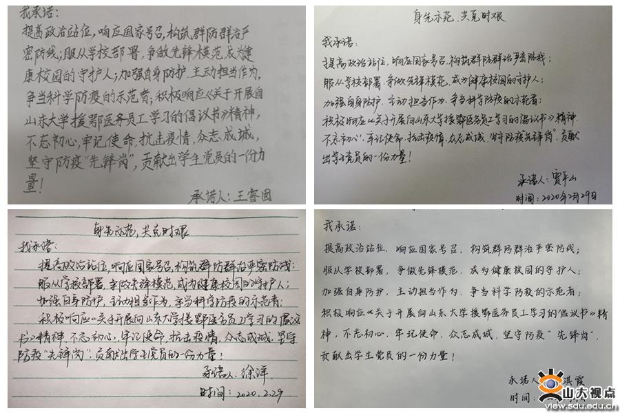 此次联合主题党日活动分为线上线下两部分组成,线上活动结束后,学生党员手写承诺书,积极响应学校向援鄂医务员工学习的倡议,并针对疫情防控期间的党员担当与作为作书面思想汇报。
