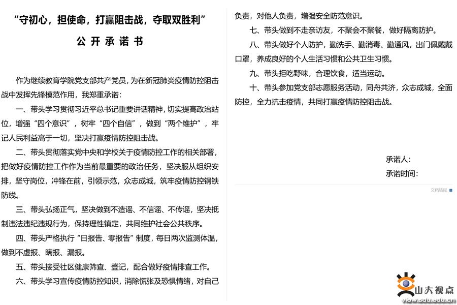 疫情就是命令,防控就是责任。当前正值疫情防控的关键时期,为切实守护好人民群众的生命安全和身体健康,仍有更多的山大人,无私无畏的坚守岗位,默默贡献着自己的力量。山东大学继续教育学院必将不忘教育初心、牢记育人使命,继续以更加积极乐观的心态、更加坚定持久的信心、更加扎实稳健的行动,高水平高质量的完成抗疫阶段的教学任务,与每一位老师和学生一起,共抗疫情,共度时艰。
