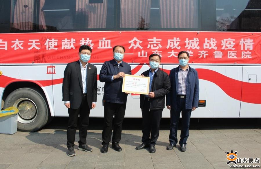 为感谢山东大学齐鲁医院对无偿献血工作的大力支持,省血液中心党委书记、主任张新童向山东大学齐鲁医院颁发感谢状。