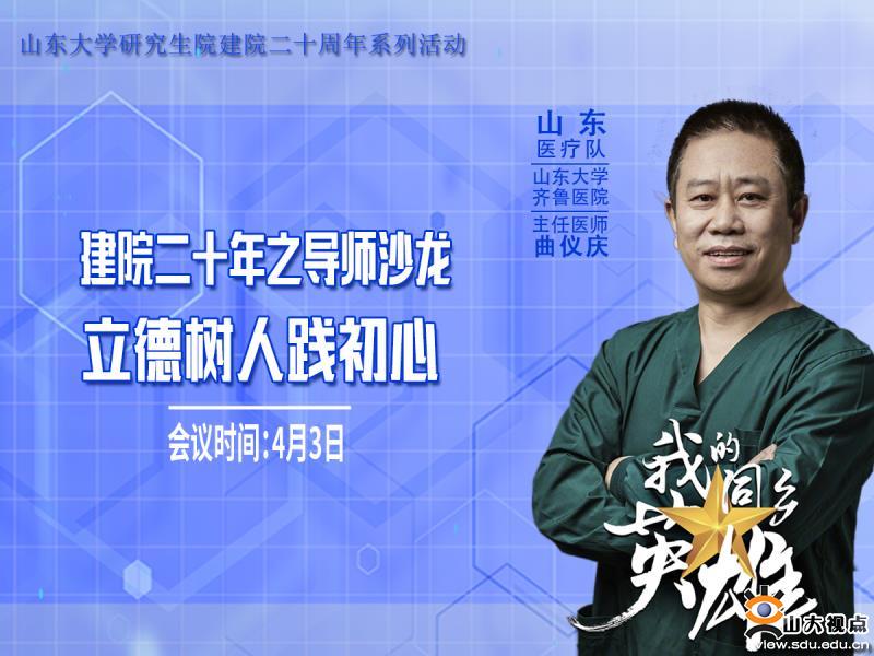 [本站讯]4月3日,研究生院举办“学习抗疫精神,践行立德树人初心”为主题的导师沙龙活动。本次活动通过在线方式进行,特邀“全国卫生健康系统新冠肺炎疫情防控工作先进个人”、山东大学齐鲁医院博士生导师曲仪庆教授主讲,来自不同培养单位的九十余位导师代表参加活动。