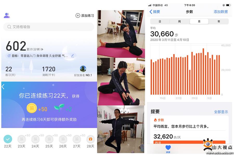 活动鼓励老师们在居家和办公室生活、工作之余充分利用身边现有条件,合理制定计划,结合自身身体状况,在保障健康、安全的前提下开展诸如健步走、跳绳、慢跑、太极拳、八段锦、简单器械体操、广播体操、小球运动、自行车,以及瑜伽等增强柔韧性和协调性的练习等一系列室内运动,运动量以身体可以承受、达到健身目的为宜,不做硬性要求。学工部门以校园为阵地,全员参与,轻装上阵,开展了跑步、瑜伽、篮球、足球、拉力器等方式多样、方便灵活的运动项目,充分展示了学工部门优良的运动风貌。同时,各单位也进行了细化,翻译学院组织学工队伍居家防疫期间每日步数不少于8000步,微信步数日常“霸榜”;数学学院、齐鲁交通学院提倡保持每日活力,坚持跑步锻炼;基础医学院组织利用学院健身设备,每日坚持增强身体核心功能;微电子学院组织下班后定时定点运动,同时带动家人共同参与;电气工程学院、文学院就地取材,走跳骑跑灵活选择,适从自身开展针对性训练;泰山学堂组织学习相关知识,从理论到实践,完成了从运动入门到熟练的改变;网络空间安全学院以体感游戏、热力舞接力等形式开展打卡,多角度的体验运动快乐;计算机科学与技术学院将太极拳与跑步相结合,土建与水利学院结合八段锦和健身操,不断提升学工身体素质。材料科学与工程学院、临床医学院、海洋学院、哲学与社会发展学院积极组织使用KEEP软件开展线上云健身,进行有氧无氧训练;空间科学与物理学院、信息科学与工程学院结合“每日瑜伽”APP,进行瑜伽训练,增强了身体柔韧性和舒展感;东北亚学院、药学院使用线上视频指导运动的形式,充分利用线上教学资源指导锻炼。