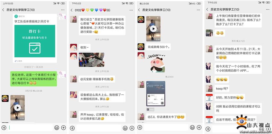 21天的坚持运动并非一蹴而就。各学院采取了多种激励督促措施,充分发扬学工队伍的团队精神。历史文化学院设立“健康锻炼心愿墙”,机械工程学院、数学与统计学院建立微信打卡小程序;儒学高等研究院、控制科学与工程学院通过在群内分享居家运动视频,互相分享学习运动心得;软件学院采取在群聊中设置团队运动任务的方式,打卡模式开展运动;化学与化工学院开设线上启动仪式,马克思主义学院成立学工锻炼小组,齐力带动教职工团队的积极性。