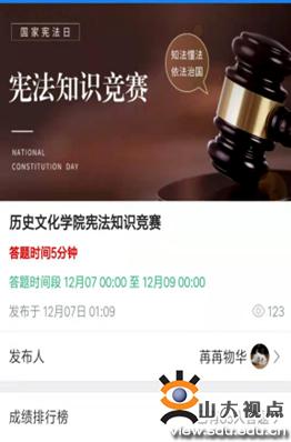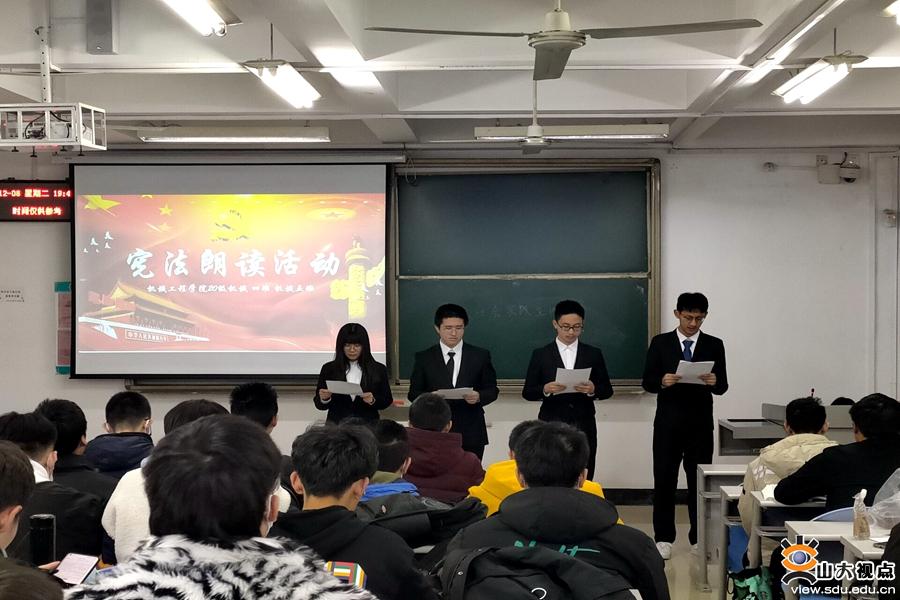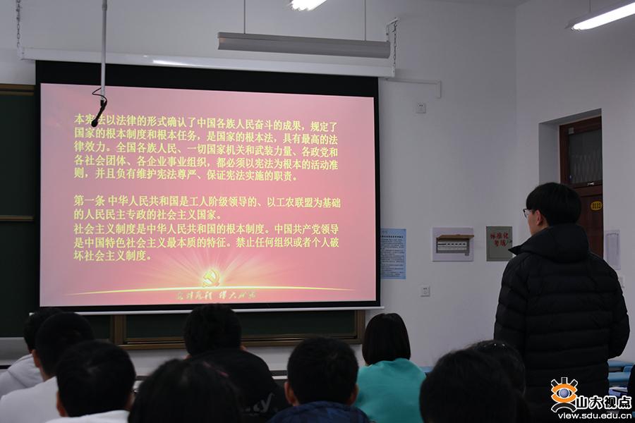 为广泛开展宪法教育周活动,加强法治精神宣传力度,各学院以年级、支部、班级、宿舍为单位,深入网格化管理服务体系,不断增强法治宣传教育的感召力、感染力和影响力。山东大学易班工作站贯通线上线下、融合宣传教育与文化活动,开展宪法知识科普宣传、发放《中华人民共和国宪法》学习材料,举办“宪法日”知识竞赛,营造“法护人人,人人护法”的良好校园氛围。电气工程学院以社会法治和德治为切入点,邀请法学院博士生导师郑智航教授作专题宣传讲座,从情感的角度解读法学的魅力,赋予宪法宣讲新的吸引力;数学学院、材料科学与工程学院通过党小组学习会、支部大会等方式,深入学习中央关于全面依法治国工作会议精神,带领学生党员重温宪法精神,交流心得体会,在宪法宣传教育活动中发挥党员的先锋模范作用;能源与动力工程学院组织观看纪录片《中国宪法》,共同回顾新中国宪法的发展历程,生动地诠释公民对宪法的理解,提升了学生知法守法,尊法爱法的法治意识;体育学院、齐鲁交通学院号召各团支部结合学院工作实际,通过观看宪法讲解视频、朗读宪法序言、开展有奖知识竞答等方式,举办思想鲜明、内容丰富的主题团日活动,提升法制宣传教育的感染力,进一步树牢“四个意识”,坚决做到“两个维护”。
