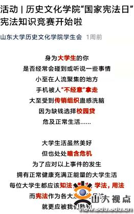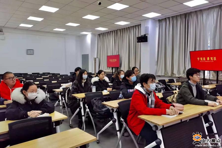 [本站讯]近期,山东大学以第七个国家宪法日、第三个“宪法宣传周”为契机,围绕“深入学习宣传习近平法治思想,大力弘扬宪法精神”主题,坚持日常宣传和集中宣传相结合,线上教育和线下教育相结合,通过宪法晨读、支部学习、社会实践、观看纪录片、发放普法宣传手册、摆设展台、微信公众号推送等多种形式,开展了国家宪法日宪法宣传周系列活动,在学生中引领了尊崇宪法、学习宪法的新风潮。