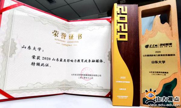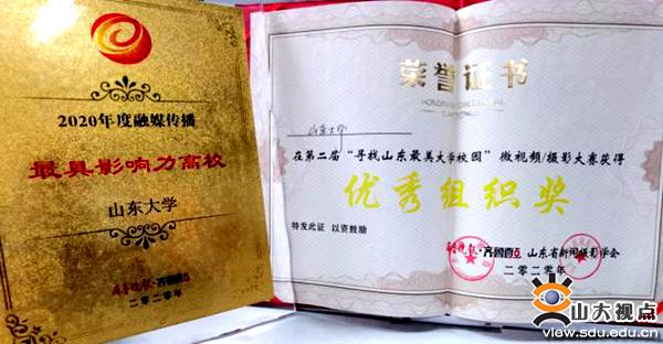 此外,山东大学分别荣获中国教育报“高校教育新闻宣传先进单位”、山东广播电视台“2020年度融媒影响力奖”、山东省互联网传媒集团“2020山东最具影响力教育政务融媒体”及“山东最佳社会声誉高校”称号,齐鲁晚报·齐鲁壹点“2020年度融媒传播最具影响力高校”,新浪2020年度山东最具综合实力的本科院校、2020年度新媒体品质运营奖、2020年度校园文化卓越宣传奖。