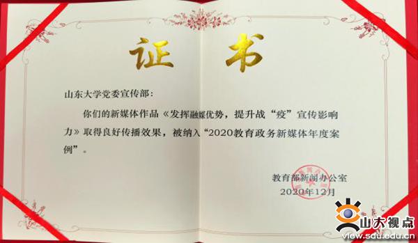 [本站讯]日前,山东大学宣传部选送的新媒体作品分别被评为教育部“2020教育政务新媒体年度案例”和人民网“2020年度优秀校园新闻作品”优秀作品。