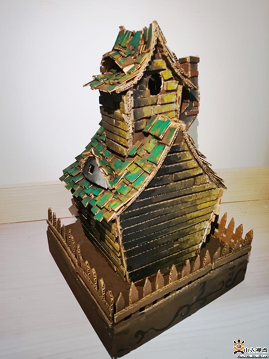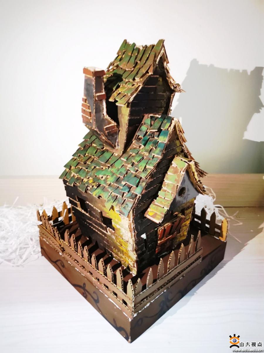 创作理念:以废纸盒为车身,废塑料为车窗,空笔杆为轴,摇身一变,为一改造版“山大校车”。车门可开,车轮可转,车箱可开,可审美,可娱乐,还可储物。我想,没有真正的“废弃物”,只是被放错了地方。人生亦然,虽有浮沉,但每个人,都会拥有闪闪发光的时刻。你看,曾经不起眼的快递盒,如今不也正被你注视着吗?
