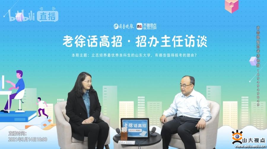 [本站讯]3月14日,“山大专业零距离”首场直播在齐鲁晚报•齐鲁壹点直播间正式开启。本科生院院长、本科招生办公室主任刘传勇与齐鲁晚报教育版资深记者徐玉芹以访谈的形式用一个半小时的时间全面介绍了山东大学的办学优势和育人特色。直播受到全国各地考生和家长的关注,实时观看流量达30万人次。直播结束后,刘传勇与现场的家长进行了深入交流,就家长关心的问题进行了解答。