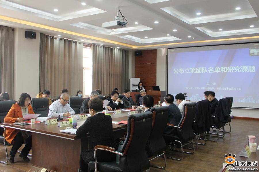 [本站讯]为进一步贯彻学校“服务山东、服务威海”战略部署,推动山东大学发展研究院(简称:发研院)的各项工作,3月19日,山东大学威海发展研究院智库团队启动会议在威海校区召开。山东大学(威海)副校长、发研院院长黄凯南出席会议并致辞。威海市政府副秘书长杨华卫、威海市发改委副主任于习文、威海市国资委副主任董家成参加会议并作专题报告。会议由发研院执行院长、商学院院长戚桂杰主持。