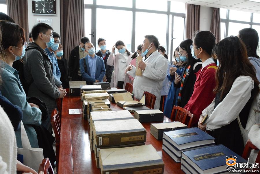 在讲解中,杨立民副研究馆员为学生们介绍了题签、牌记等对于古籍版本鉴定的意义,并向学生们展示了地方志古籍文献的结构和艺术之美,如装帧形式、印刷版式等。杨立民副研究馆员还通过书中所印不同时期的藏书章,向学生讲解了山东大学及图书馆的演变发展历程。他强调,地方志是重要的地方文献,是一个地区的史书,对考证地区发展有着重要的历史意义,有“存史、资治、教化”的重要作用。