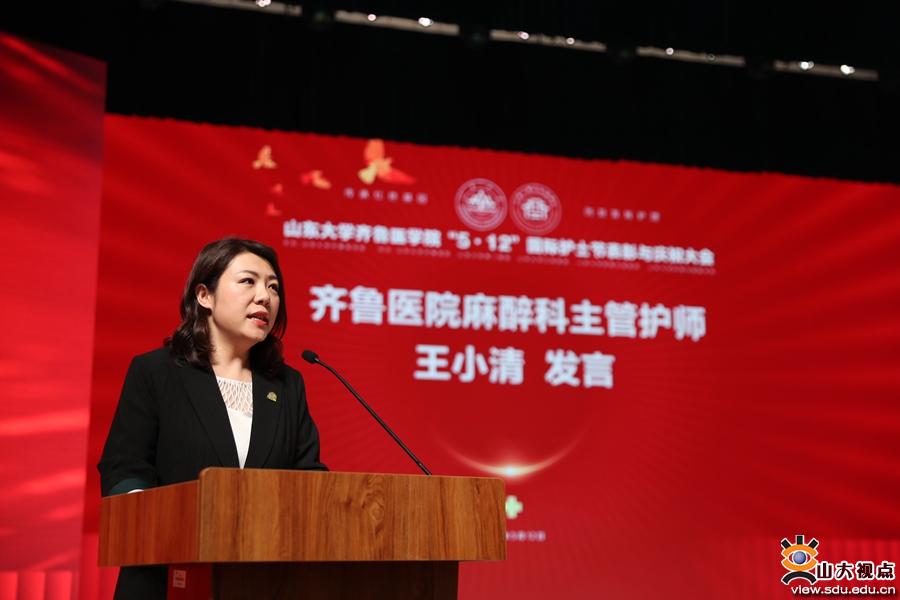 优秀护士代表、齐鲁医院麻醉科主管护师王小清在发言中分享了2020年初新冠病毒肆虐荆楚大地,齐鲁医院护理团队白衣执甲,逆行出征的切身经历。她表示,疫情当前,我们是护士,我们也是战士,在武汉工作的日日夜夜,我们始终秉承着“甘于奉献、救死扶伤、勇于献身”的人道主义精神,穿着厚重的防护服,衣衫被汗水无数次浸透,承受着高风险、高强度工作带来的压力,但我们依然感受爱、付出爱、播撒爱,用温柔与微笑面对每一个患者。今后,我们将在学校、医院的培养与关心引领下,立足本职工作,守初心、担使命,弘扬南丁格尔救死扶伤的人道主义精神,传承“人民至上,生命至上,举国同心,舍生忘死”的抗疫精神,追求卓越,只争朝夕,以优异成绩向建党100周年和建校120周年献礼。