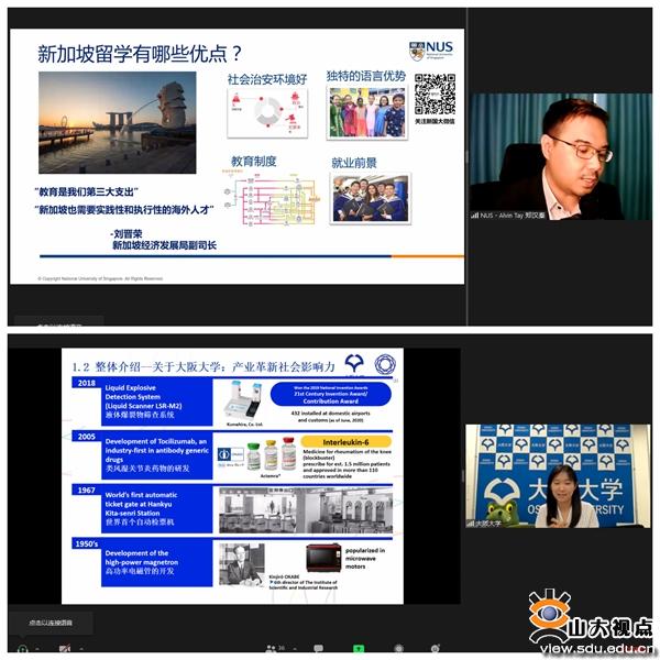 [本站讯]5月28日,山东大学境外学习项目交流展(亚洲、非洲专场)举行。本次交流展采用线上、线下相结合的方式,邀请新加坡国立大学、韩国成均馆大学、日本大阪大学、埃及开罗大学等亚非高校介绍留学项目,并设线上、线下会场介绍学校海外经历相关政策并现场答疑。济南、威海、青岛三地各学院师生和相关职能单位负责人300余人次参加活动。