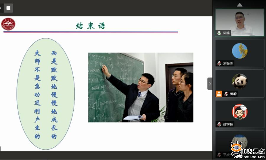 [本站讯]5月28日晚,泰山学堂在线举办了“英才计划系列讲座”第一期,山东大学党委常委、副校长吴臻教授作“大师是默默地、慢慢地成长的”报告,2021届英才计划学员在线参加活动,该讲座由泰山学堂专职副院长刘振美主持。
